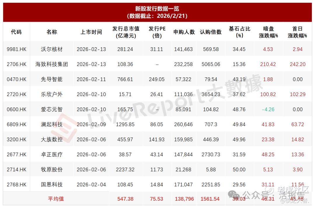 据**大数据,近10家上市新股平均发行市值为547.38亿,最大市值为牧原股份,最小市值为乐欣户外;平均发行PE为75.53倍,PE水平处于高位;平均申购人数为138,796人,平均认购倍数为1561.54倍;平均基石占比为46.31%,基石平均比例有所回升;