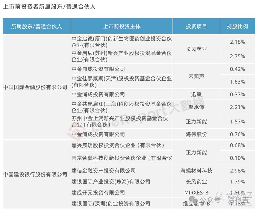 投资项目数量最多的上市前投资者是中金公司,分别投资了长风药业、云知声、迅策、聚水潭、正力新能等,其持有每家公司的股份比例高低不一,其中通过不同主体分别投资了两次长风药业和云知声,合计持股分别约4.93%及2.05%。
