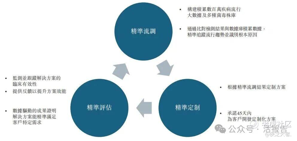 (i)为客户提供精准防控解决方案。这涉及「精准流调、精准定制、精准评估」的服务体系:公司通过精准流调检测结果及时准确识别流行菌株及其变异趋势,据此通过精准定制开发更新解决方案以应对流行菌株,并通过精准评估持续追踪临床疗效;