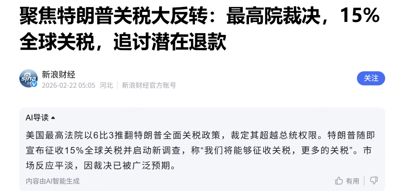 周五晚美国最高法院以6比3推翻美国总统特朗普的全面关税政策,裁定其超越总统权限,因裁决已被广泛预期,市场反应相对平淡,美股指也出现了反弹。但很快,特朗普随即表示了不满并宣布征收15%全球关税(原关税为10%)并启动新调查,称“我们将能够征收关税,更多的关税”。由于加征关税部分在周末宣布,因此周一就是检验市场对该消息的敏感程度,总体来说,加征关税对美股指来说属小幅利空,但对金银来说,可能是重新上涨的催化剂。