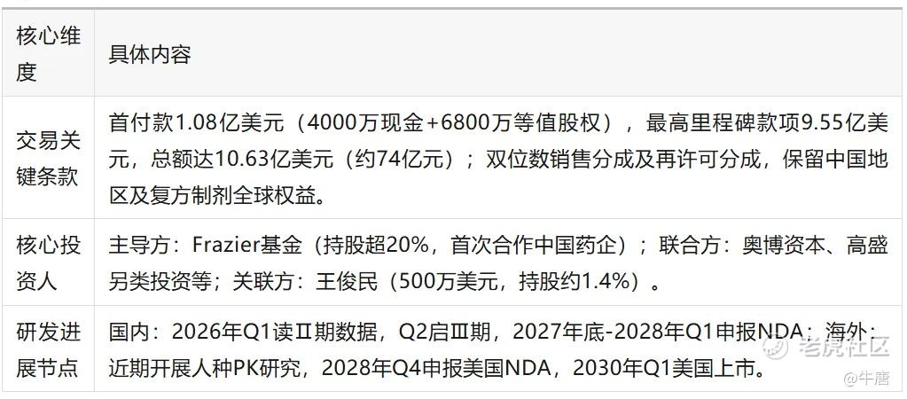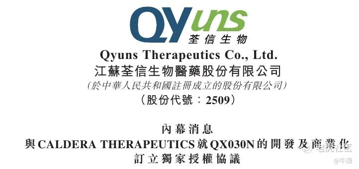 药物授权的对价是Caldera Therapeutics公司向荃信生物支付1000万的首付款,以及24.88%的公司股权,最多5.45亿美元的里程碑付款;此外,荃信生物有权在QX030N首次商业销售后的一段特定时间内收取销售净额的分级特许权使用费。