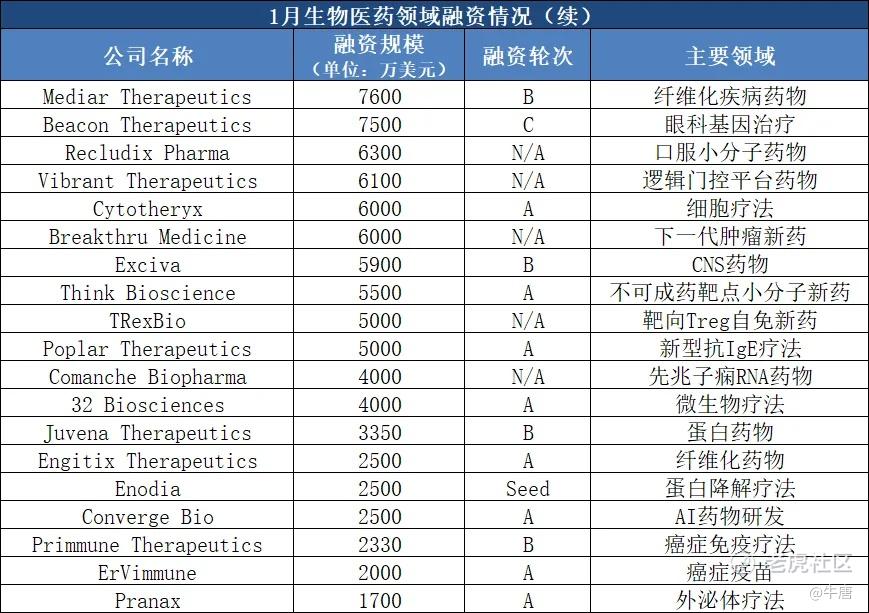 前沿技术路线与新靶点受到关注:1月,不可成药靶点药物公司Parabilis、 干细胞疗法公司Medipost、疾病修饰性聚类抗体药物公司Diagonal等前沿技术企业均获得大额融资。