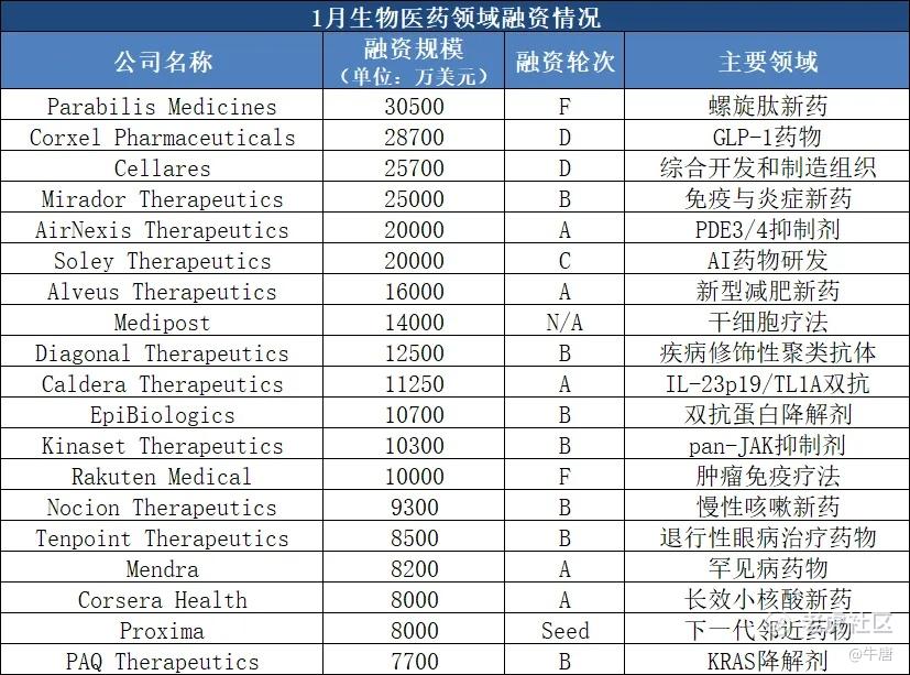 热门赛道仍受追捧:1月,有融资2亿美元的AI药物公司Soley ,融资1.6亿美元的减肥药公司Alveus,融资2.5亿美元的自免药物公司Mirador,融资8000万美元的小核酸药物公司Corsera,融资1.07亿美元的蛋白降解疗法公司EpiBiologics等热门赛道企业;