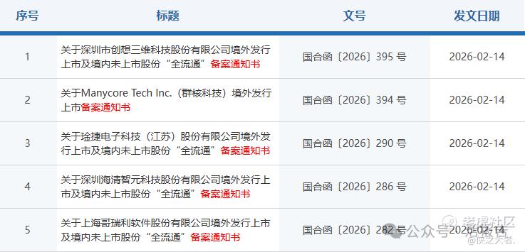 创想三维于2026年2月12日通过备案,拟发行不超过150,808,200股境外上市普通股并在香港联合交易所上市。公司21名股东拟将所持合计393,412,551股境内未上市股份转为境外上市股份,并在香港联合交易所上市流通。公司备案耗时160天。