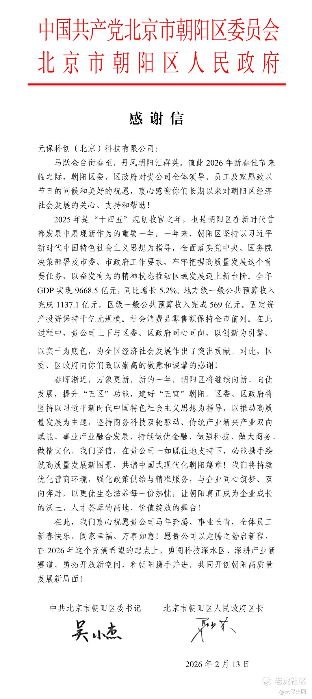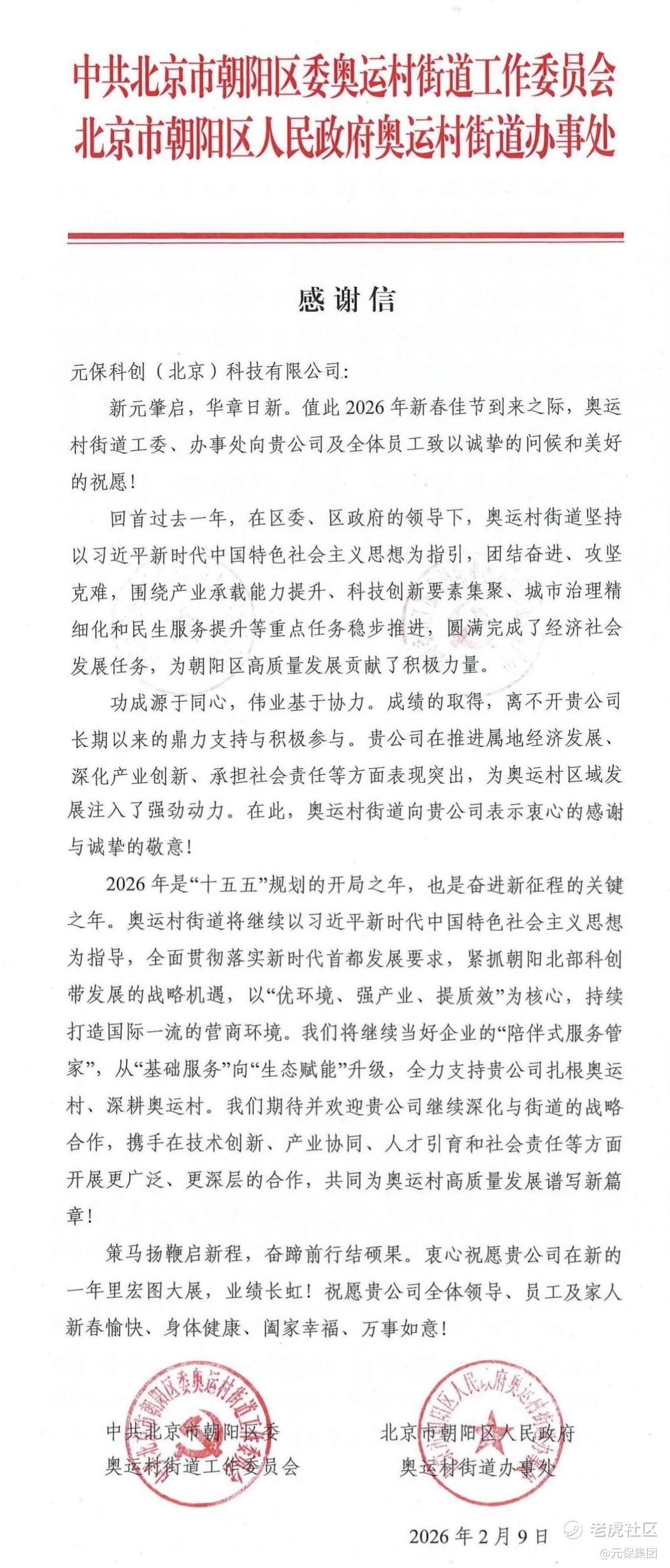 感谢信中,中共朝阳区委、朝阳区人民政府及朝阳区奥运村街道工委、办事处为元保送上了真挚的新春祝福,更对元保长期以来的付出与贡献给予充分肯定。元保始终扎根朝阳、深耕朝阳,以创新为引擎、以实干为底色,在助力属地经济发展、深化产业创新、践行社会责任等方面主动作为,在产业发展与社会服务中展现出的企业担当与创新活力,为朝阳区及奥运村街道的高质量发展注入了元保力量。