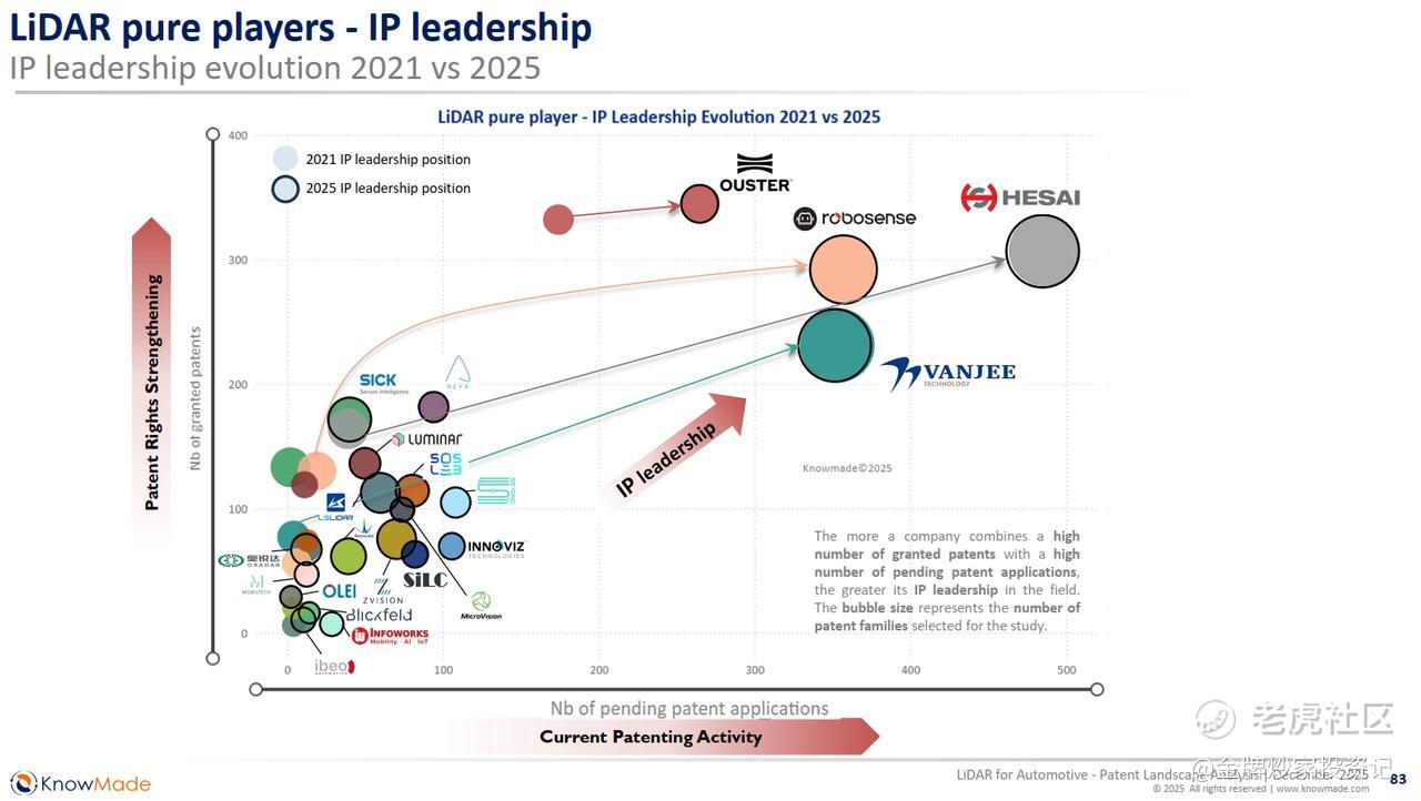 先说技术实力。法国知名分析公司Yole旗下的知识产权专业机构KnowMade刚发了份报告,禾赛激光雷达专利数量全球第一,专利综合强度全球第一。这不是那种注水的数量第一,而是实打实的质量领先——抗干扰专利全球第一,SPAD/SiPM探测器专利数是行业第二名博世的2倍,是其他同行最高40倍。