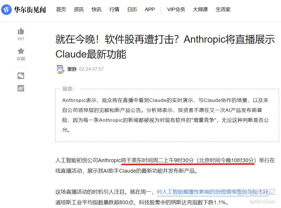 大多数的投资者们,都不愿意在又一次 Anthropic 发布会前冒险,因为每一条 Anthropic 的新闻都被视为对现有软件的增量竞争。这意味着AI公司的任何更新都可能引发系统性抛售,Claude 的直播成为新的黑天鹅候选事件,类似于 OpenAI 发布 GPT-4 时的模型涨跌周期,这是一种非理性但很真实的市场机制。
