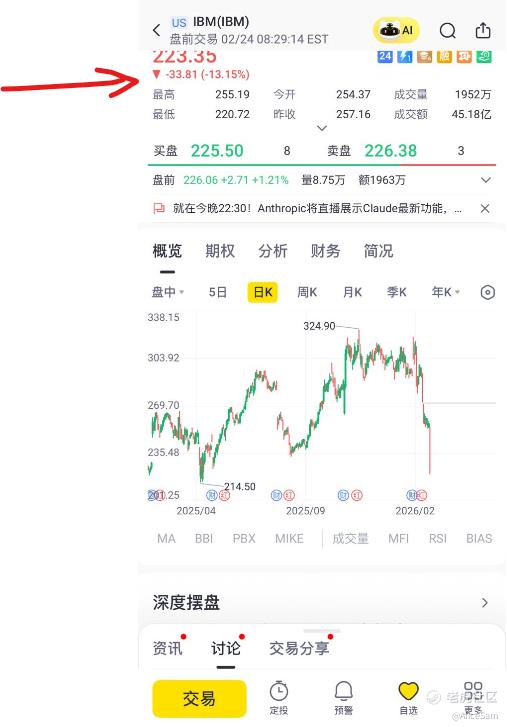 虽然 IBM正在从主机,咨询向AI和混合云转型,但转型速度仍赶不上市场对AI颠覆的想象速度。 看IBM的Q4财报,其实业绩仍然是强劲,包括147亿美元的十年最高自由现金流 和 12% 的营收增长。可惜这次Claude Code恰好触及IBM 50 年来最稳固的收入核心。