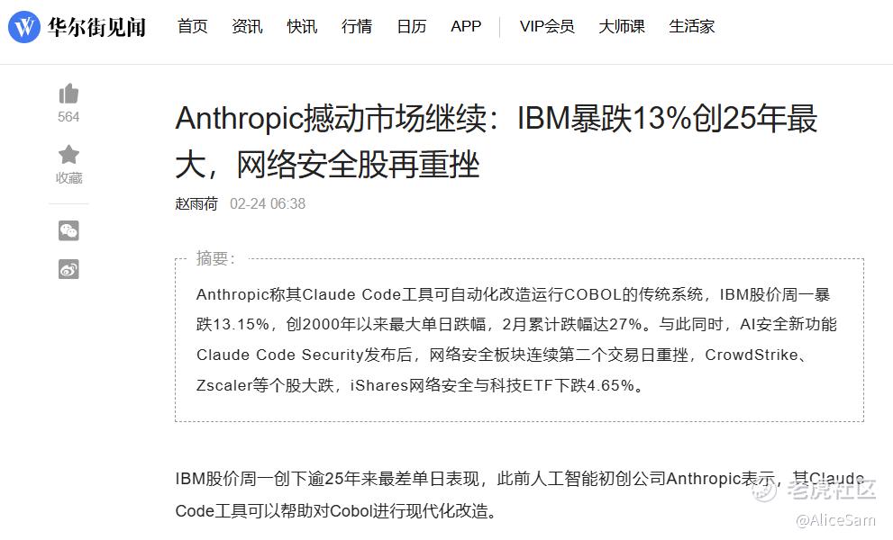 IBM 的相关收入主要来自主机(Infrastructure),安装,升级,维护。还有咨询Consulting)现代化,迁移项目。还有软件Software,主机配套业务。Claude Code直接切入咨询与现代化,而这恰是IBM的高利润来源。因此市场瞬间意识到AI可以重写COBOL,企业迁移主机系统更便宜,未来对IBM的依赖度下降,IBM咨询收入长期承压。这是一种严重的长期利润池被撕开的预期重定价!