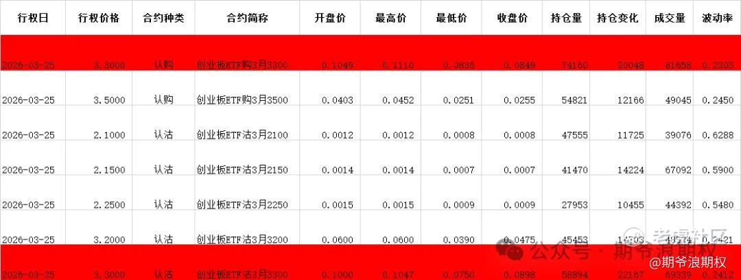 (3)创业板ETF期权:3月最大持仓范围3300-3300,今收3.295,上涨0.92%。期权3月合约,认购和认沽都以增仓为主。认购减仓集中在3100-3800,合计6.7W张;认沽增仓集中在两个区域,一个是2100-2300,合计4.8W张,另一个是2900-3400,合计6.0W张。变化超过1W张的仓位如下,红色是增仓较大的。多空在3300的位置有分歧,从今天的期权盘路看,市场偏乐观,但也担心系统性风险。
