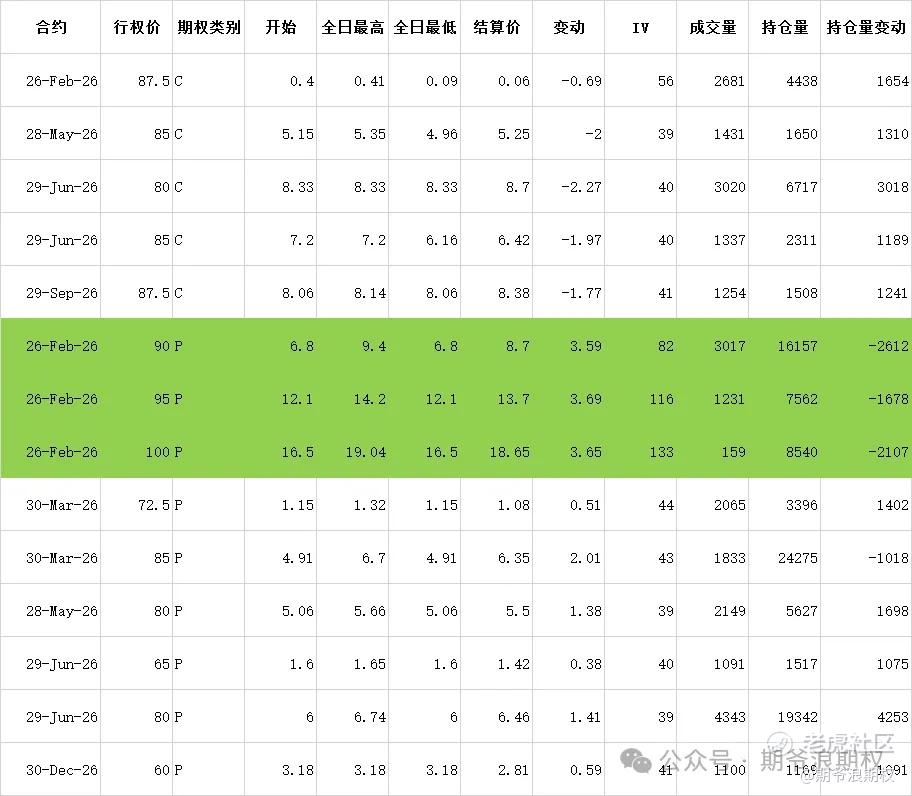 (3)美团:3月最大持仓范围85-110,窝轮牛熊街货分布75-100,今收81.4,下跌4.24%。期权盘路变化超过1000张的仓位如下,浅绿色是2月深度实值减仓,资本大佬原计划买入美团的现在不买了。短期内80是多空对战的一个位置,回看过去一周多的大佬布局,远月继续偏悲观。