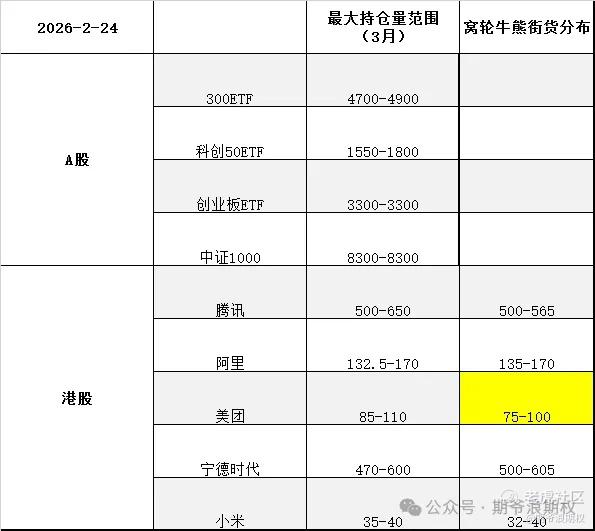 下图是今天大A的3个ETF和中证1000,以及港股的腾讯、阿里、美团、宁德和小米的最大持仓量范围以及窝轮牛熊分布范围,也就是3月的期权筹码分布,黄色的表示跟上个交易日有变动。