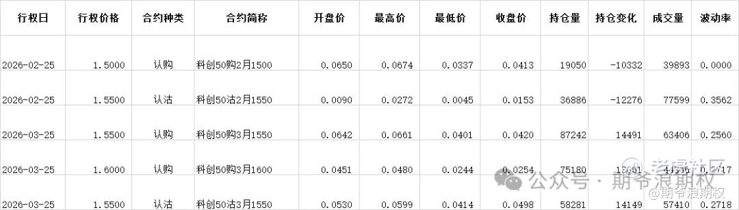 (2)科创50ETF:3月最大持仓范围1550-1800,今收1.543,下跌0.32%。期权3月主力合约,认购以增仓为主,集中在1450-1850,合计5.9W张;认沽低行权价减仓高行权价增仓,减仓较少,增仓集中在1450-1650,合计3.5W张。变化超过1W张的仓位如下,多空在1550的位置有 分歧,从今天的期权盘路看,市场总体偏乐观。