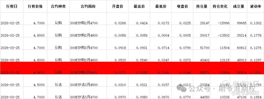 (1)沪深300ETF(沪)期权:3月最大持仓范围4700-4900,今收4.716,上涨0.96%。期权3月主力合约,认购和认沽都以增仓为主。认购增仓集中在4700-4900,合计4.6W张;认沽增仓集中在4500-4800,合计2.9W张。变化超过1W张的仓位如下,红色是增仓较大的。多空再4700的位置有分歧,从今天的期权盘路看,市场总体偏乐观。