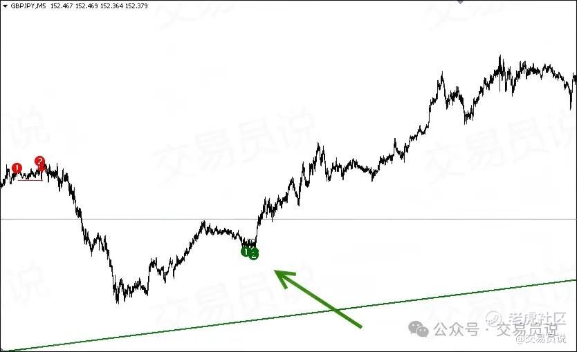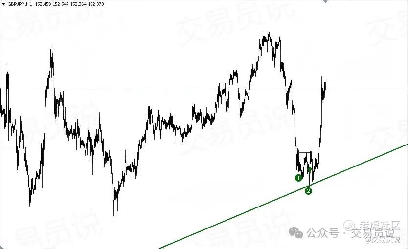 当你切换到较小的时间周期时,就能够识别出一些潜在的交易机会,例如在趋势线附近形成的双底形态。当这种形态出现时,你可以更有信心地顺着趋势方向进行交易。