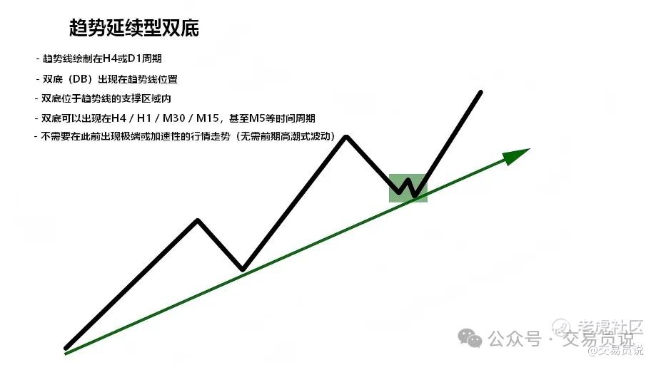 当双底或双顶形态在趋势中形成时,往往可能意味着趋势延续。例如,图3展示了上升趋势线上的双底形态。
