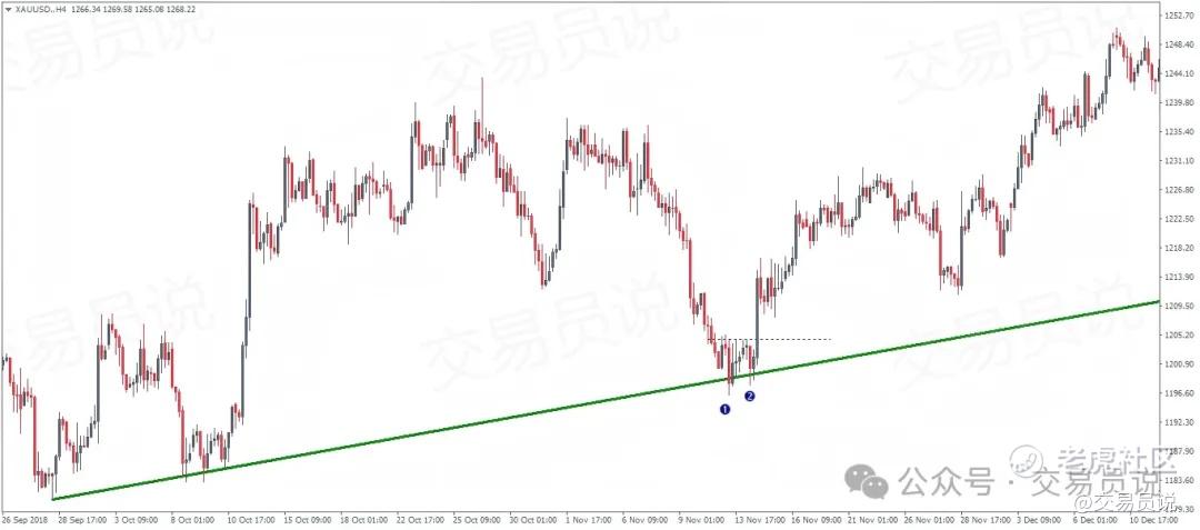 图5:上升趋势中靠近趋势线的双底形态