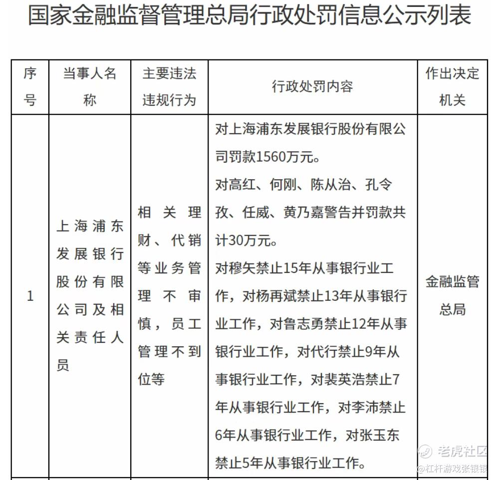 2025年12月19日,浦发银行因相关理财、代销等业务管理不审慎,员工管理不到位等,再次被金融监管总局罚款1560万元。