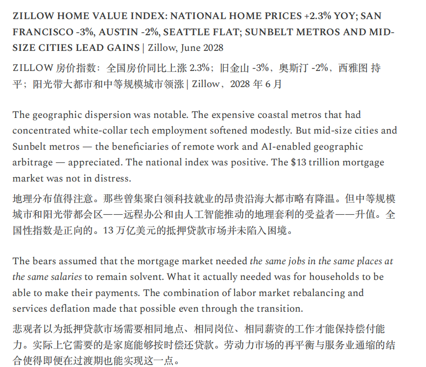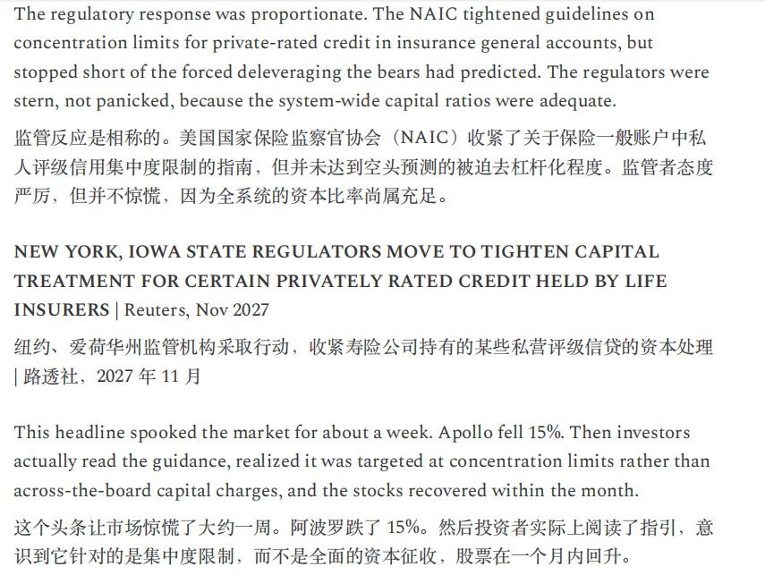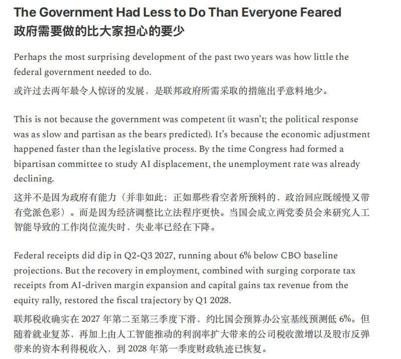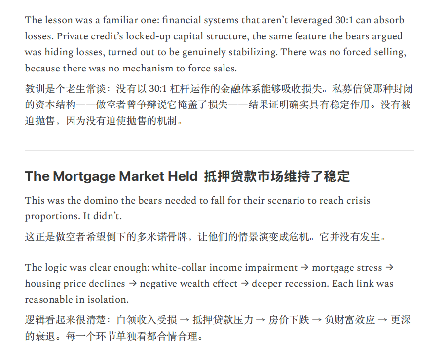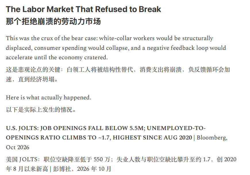 另一条发生在金融体系,收入预期的结构性受损开始侵蚀私募信贷与住房按揭等建立在白领现金流之上的资产定价,并迫使监管与政策讨论加速,但报告同时强调,政策响应持续滞后,公众对政府“救援能力”的信心下降,正在放大通缩螺旋风险。