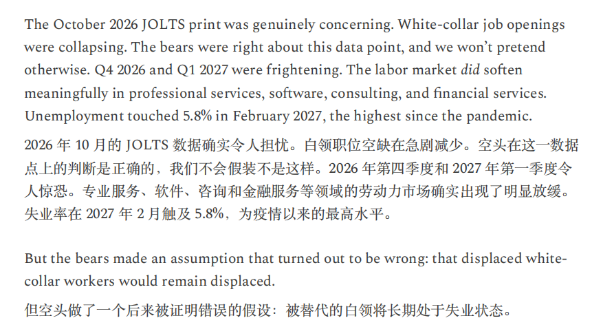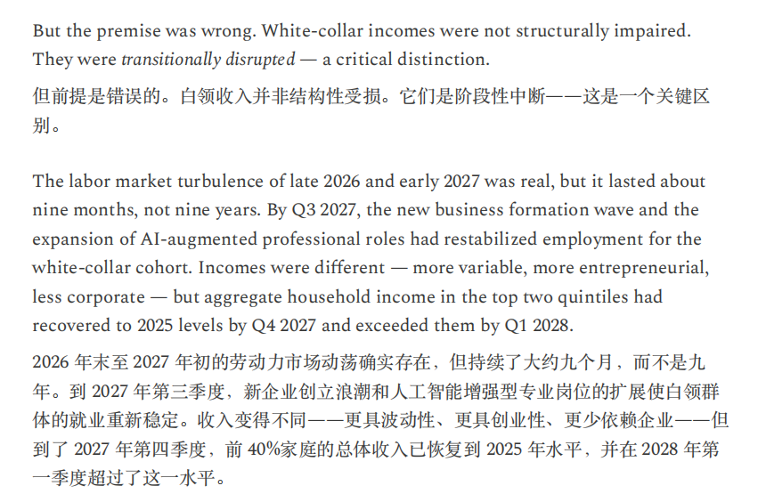 在这份以“2028年6月”为时间锚点的思想实验中,美国失业率升至10.2%,较预期高0.3个百分点,数据公布后市场下跌2%,标普500从“2026年10月高点”累计回撤38%。备忘录称,交易员对冲击已趋于麻木,六个月前类似数据本可能触发熔断。