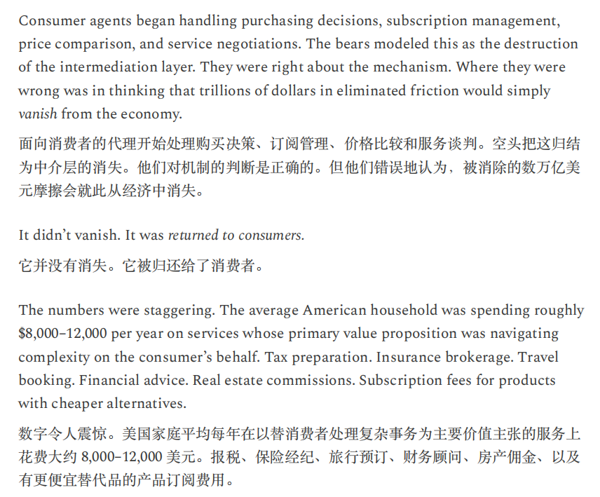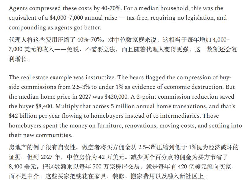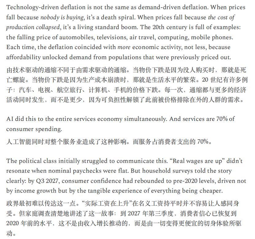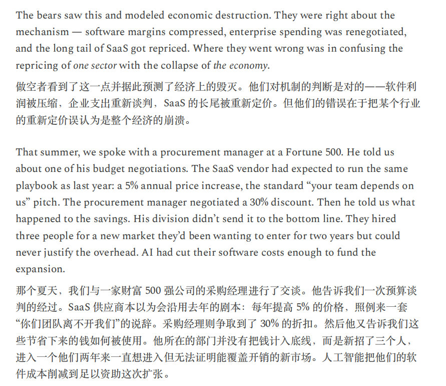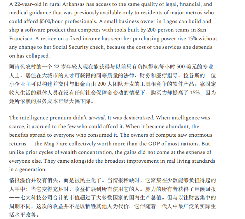 或许,正如Citrini所言,“当机器产生的输出等同于1万名白领,却不消耗一分钱的社会服务时,这不叫经济奇迹,这叫经济瘟疫。”