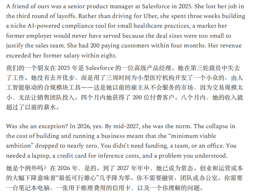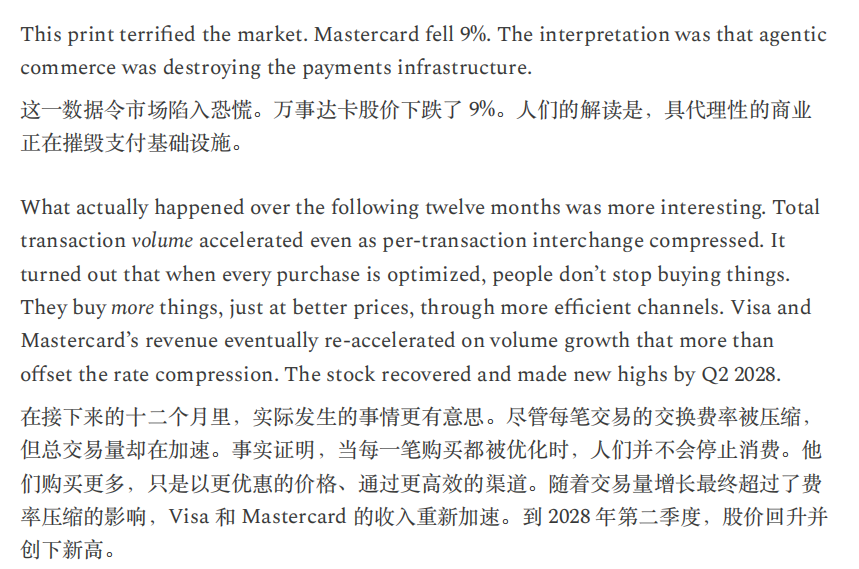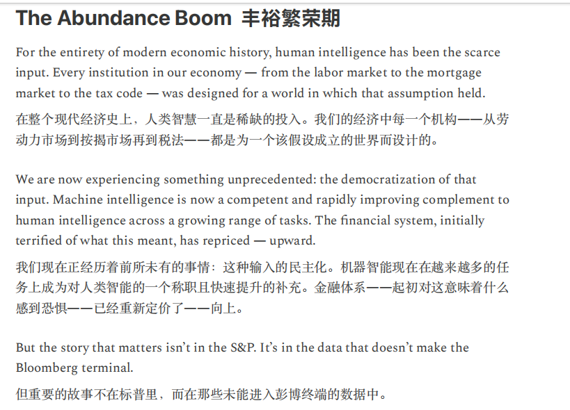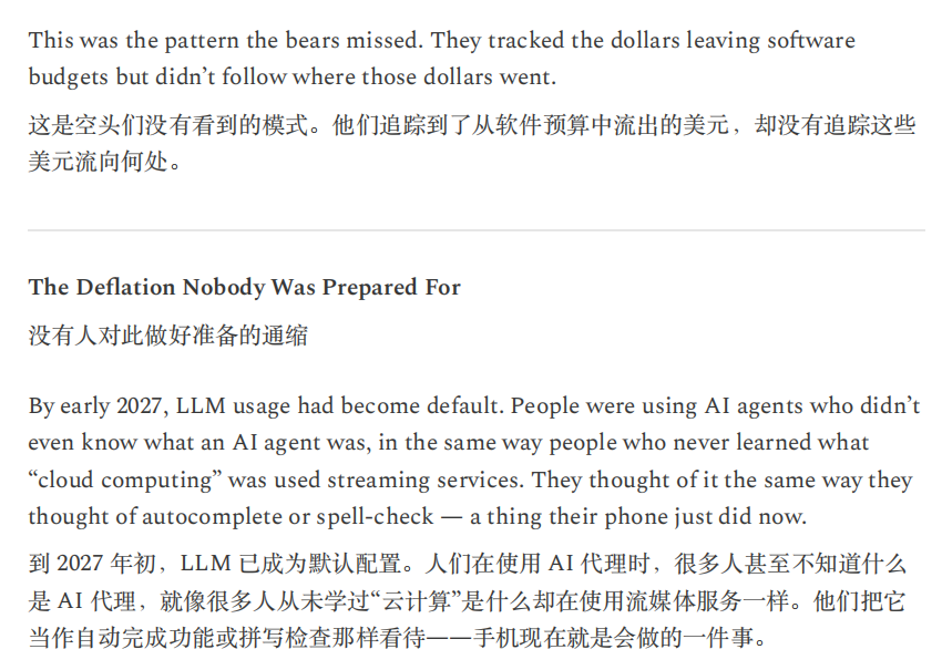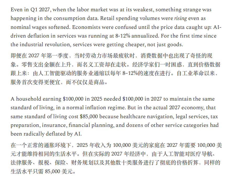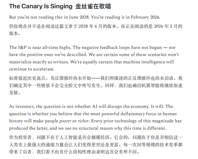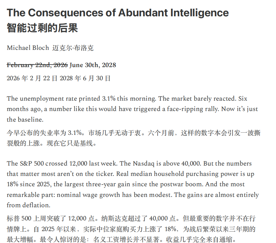 CitriniResearch与Alap Shah一份“来自未来的宏观备忘录”提出一个虚构的命题:AI多次超越乐观预期并不必然利多资产与经济,相反,充沛的机器智能可能通过挤压劳动收入与消费循环,触发一场由“生产率繁荣”引出的需求收缩与金融再定价。