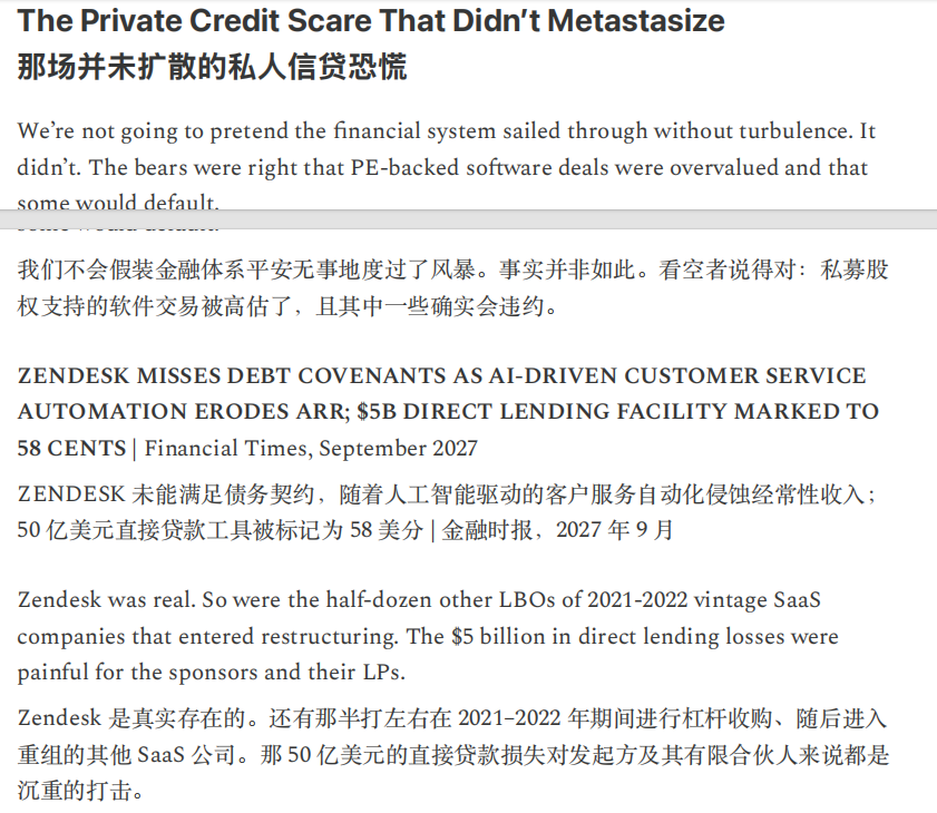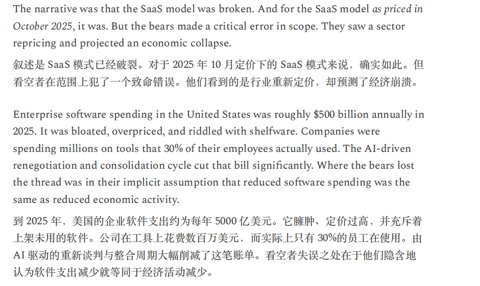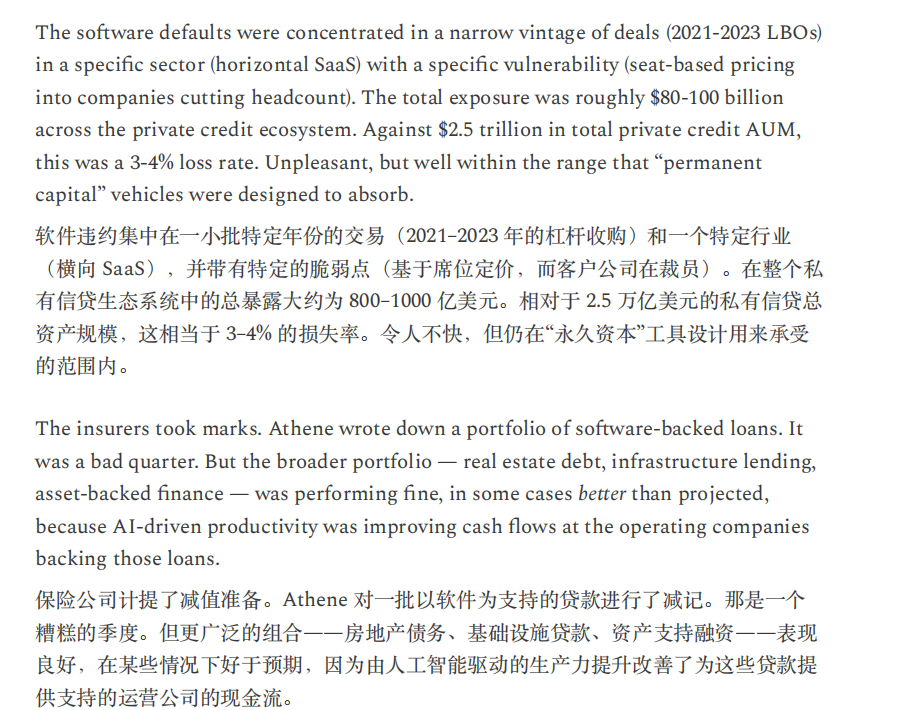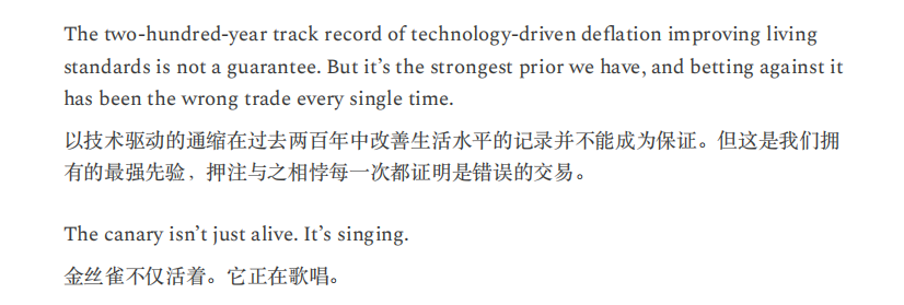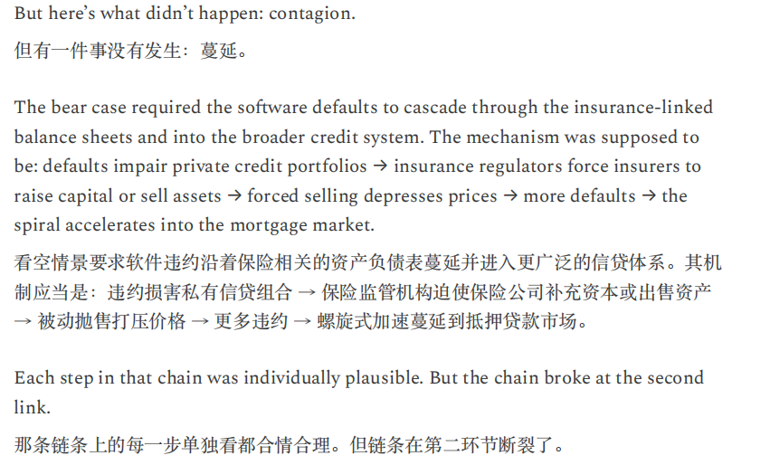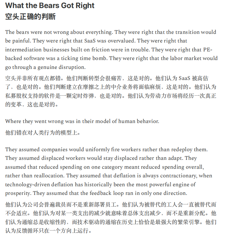 笔者认为,文中这种情况过于悲观且终局思维。就目前来看,美国劳动力市场稳健,AI裁员没有想象中厉害,甚至因为开发AI还造就了许多新岗位。经济增长稳健,非农生产率提高,代表AI确实对生产力提升有所贡献,而且占比不小。软件股确实面临冲击,但笔者认为哪怕按照没有甚至负增长来估值,价格也不贵,何况目前不存在直接亏损退市的风险。信贷市场则存在一些裂痕,也是需要注意监测的,但白宫给星际之门背书,AI巨头背靠国家队,如果暴雷有人兜底。通缩担忧更是过于夸张,现在美国通胀还持续高于预期和美联储目标,除非生产率一夜之间上涨几倍,不然现在的美国担忧通缩就像中国足球担忧奖杯太多陈列室放不下怎么办一样。