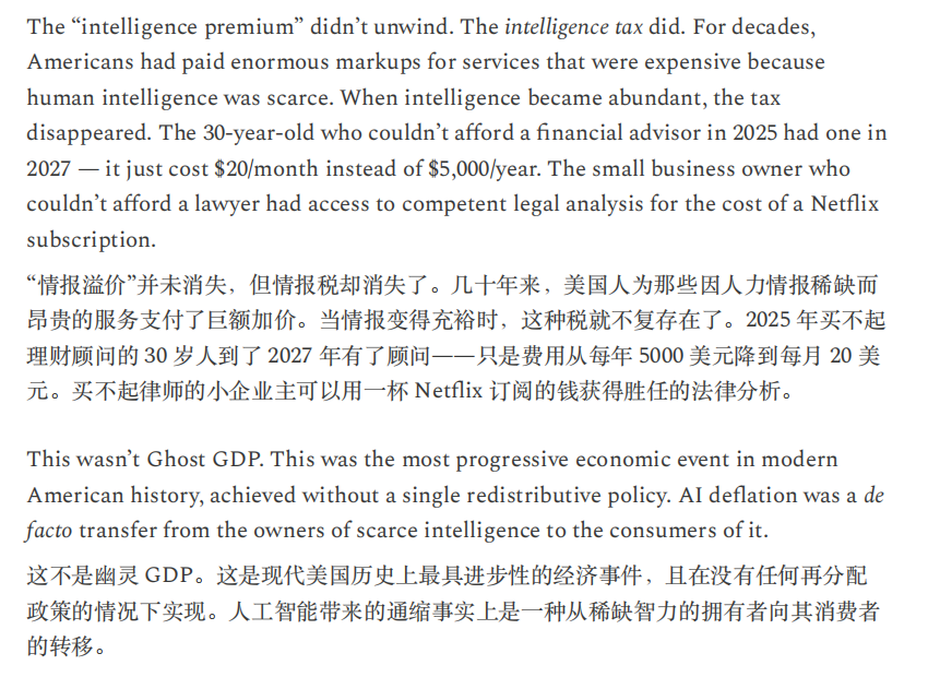 报告将危机路径拆解为两条相互强化的链条:一条发生在实体经济,AI能力提升推动白领岗位被替代,实际工资增速塌陷,消费占比高的“以人为中心”的经济萎缩,形成“没有自然刹车”的负反馈回路,市场一度只看AI、但经济本身开始变形,催生所谓“Ghost GDP”,即产出计入国民账户却难以在真实经济中循环。