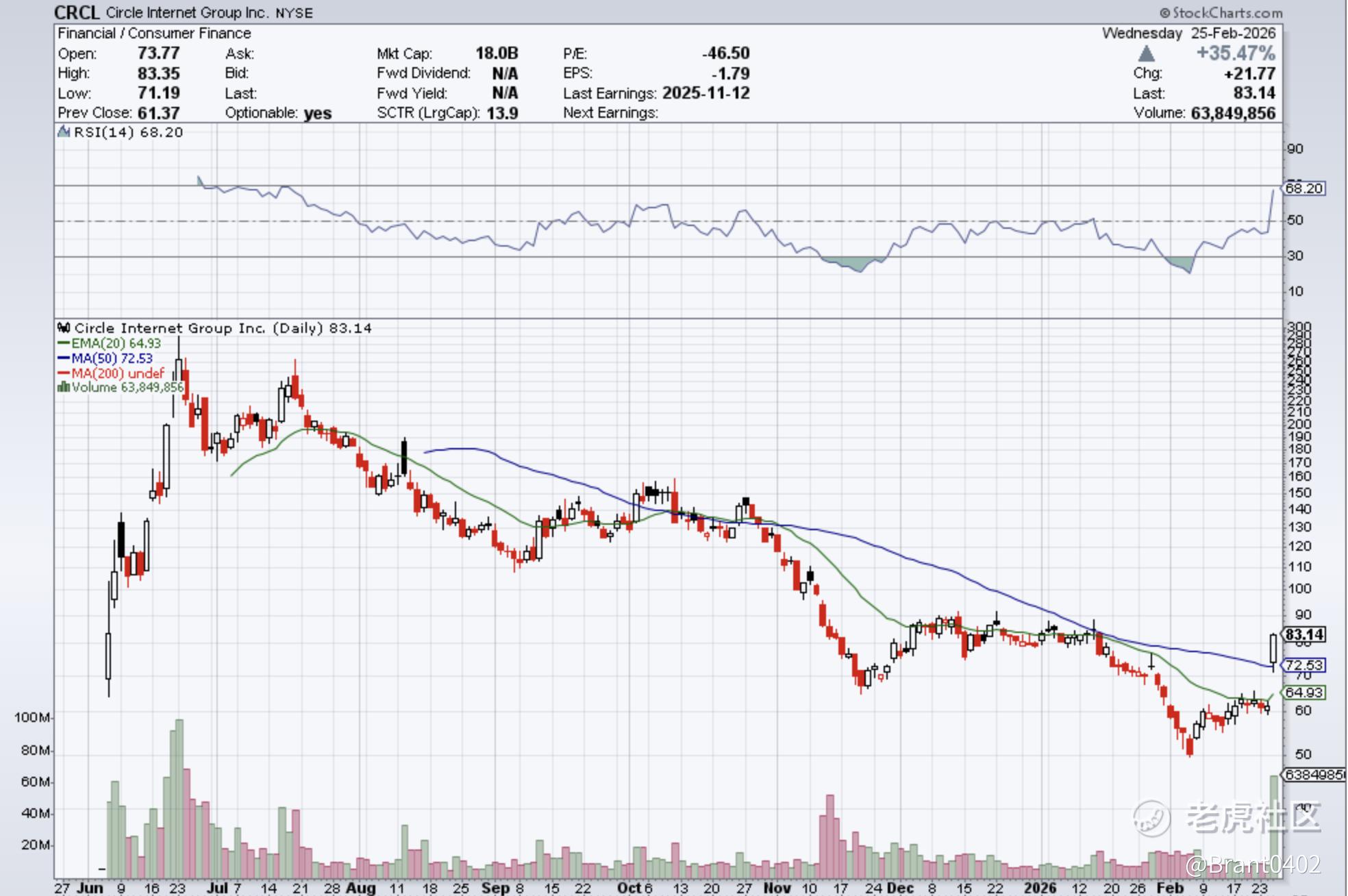 在经历自IPO后高点近80%的深度回撤后,全球第二大稳定币发行商 $Circle Internet Corp.(CRCL)$ 终于迎来一份足以扭转情绪的财报。这份远超市场预期的Q4业绩引爆了股价,使其单日飙升35.47%,创上市以来最大单日涨幅,报收于83.14美元。