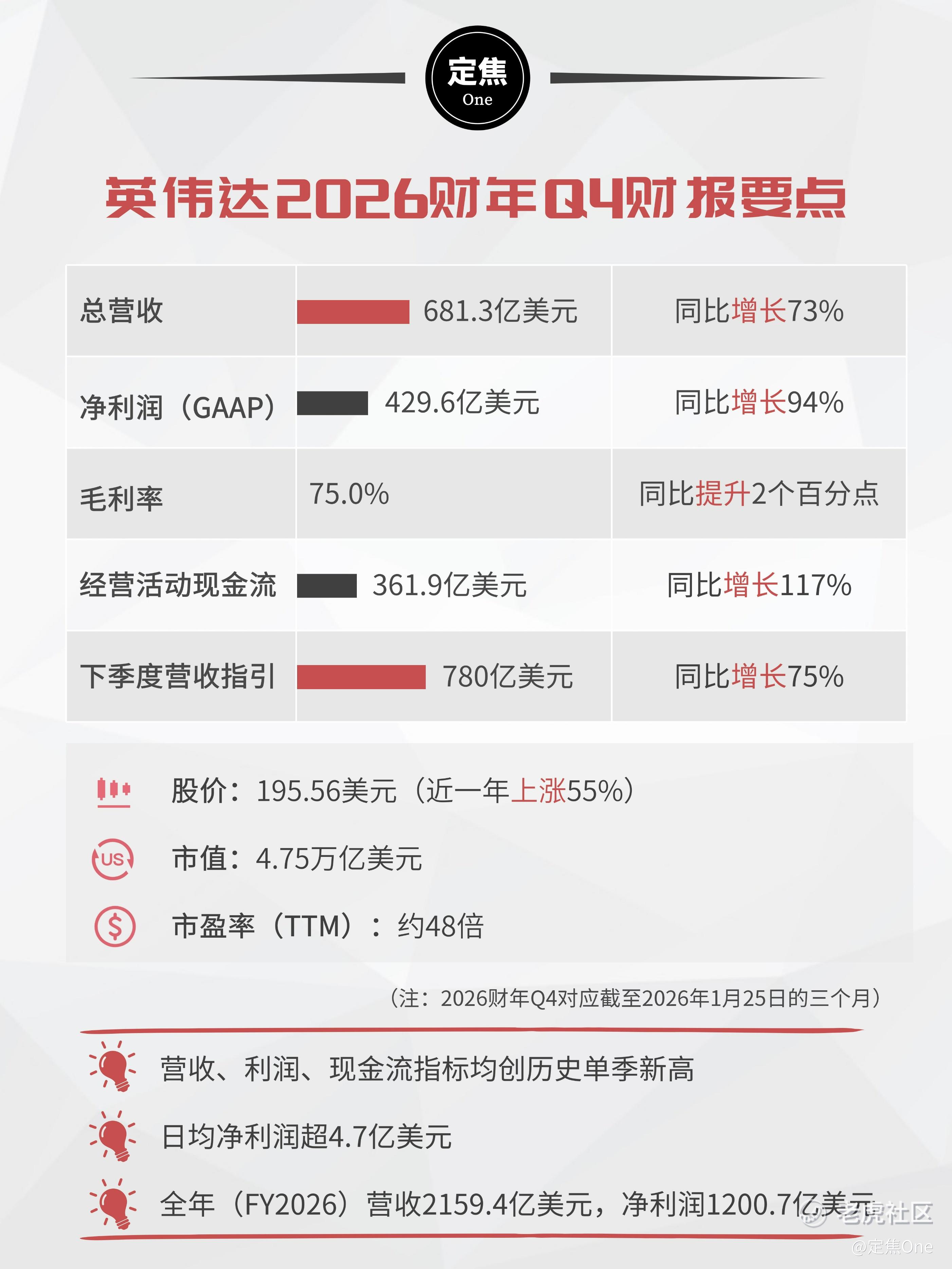 2月21日,英伟达公布了2026财年第四季度财报,再次以碾压式的数字震撼市场。总营收高达681.3亿美元,同比增长73%;GAAP净利润达到429.6亿美元,同比猛增94%——相当于平均每天净赚超过4.7亿美元。营收、利润、现金流三项核心指标均创历史单季新高。