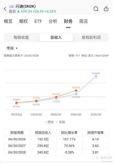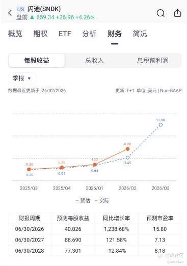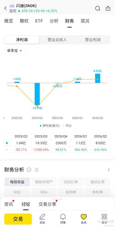每股收益EPS6.20 美元,远超预期的 3.31 美元。由于市场进入卖方市场,SNDK每GB的平均销售价格ASP在本季度增长了 30%以上。分析师预计2026年NAND闪存价格将持续保持坚挺。难怪EPS能这么优秀。看看个股页面的这个季度对比图,EPS从2025Q4的-0.23,到现在2026Q2的神迹反转6.20,这是一个结构性反转。他们这是要上天啊,下个季度的EPS预期直接挂在月球上了啊。[开心]
