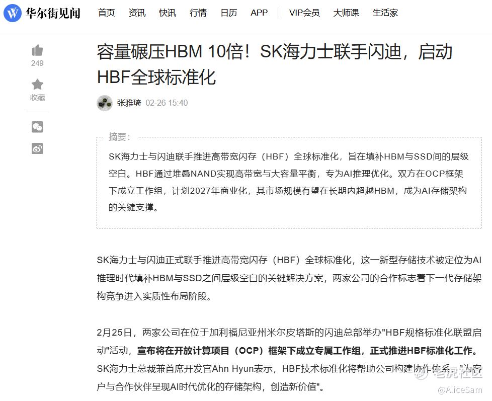 看新闻说,闪迪与SK海力士宣布启动HBF(High Bandwidth Flash)规格标准化联盟,发布下一代面向AI推理的存储器解决方案,这一技术合作旨在解决日益增长的人工智能数据处理需求,这也是一个重大利好消息啊,跟财报叠堆了。[开心] 此次标准化启动意味着,能够同时提供HBM与HBF的全栈存储解决方案供应商战略地位将持续提升。