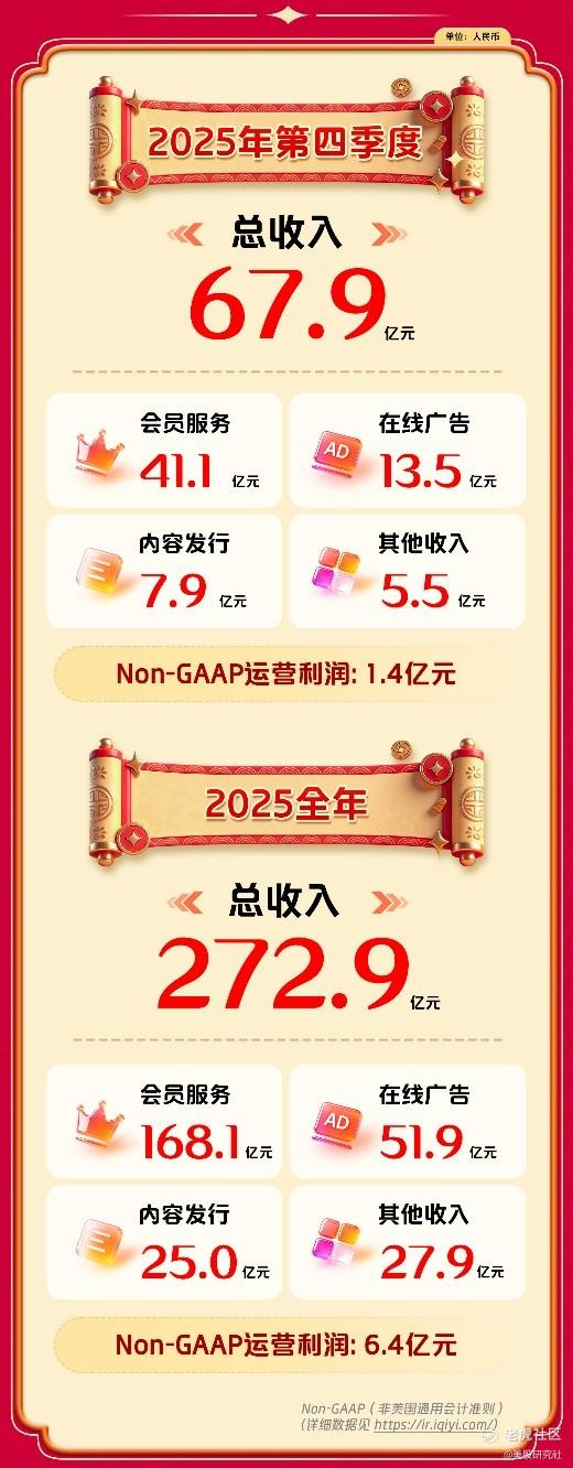 2月26日,爱奇艺(NASDAQ:IQ)发布截至2025年12月31日未经审计的第四季度及全年财报。全年总收入272.9亿元人民币,Non-GAAP(非美国通用会计准则)运营利润6.4亿元,连续四年运营盈利。其中,第四季度爱奇艺总收入67.9亿元,实现同环比双增长。Non-GAAP运营利润为1.4亿元。