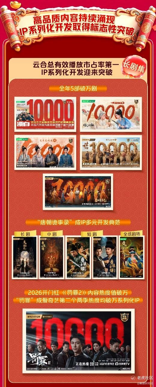 内容是爱奇艺发展的基石。长剧集方面,第四季度优质内容持续涌现,爱奇艺稳居云合剧集总有效播放市占率第一,IP系列化开发迎来突破。《唐朝诡事录》成为首个连续两季作品内容热度值破万的IP,《唐朝诡事录之长安》在2025年新上线剧集中广告收入表现第一,会员收入表现第二。短剧《唐诡奇谭之长安县尉》和《唐诡奇谭之九重楼》接连刷新短剧内容热度值记录。两部短剧首周观众中,均有超70%看过该系列长剧,显示多样化的内容形态有效延展了IP生命周期。2026开年,警匪刑侦剧《罚罪2》内容热度值破万,“罚罪”成为爱奇艺第二个两季内容热度值均破万的系列化IP。