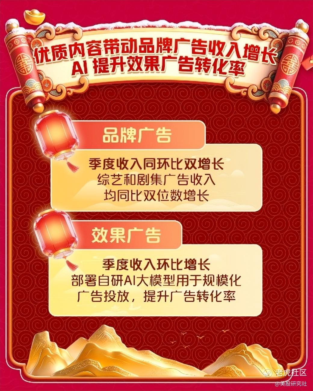 会员服务之外,第四季度在线广告服务收入13.5亿元,环比增长9%。其中,品牌广告收入同环比双增长,综艺和剧集的广告收入均实现同比两位数增长。效果广告收入实现环比增长,通过部署自研AI大模型用于规模化广告投放,提升广告转化率。当季,内容发行收入7.9亿元,其他收入为5.5亿元。