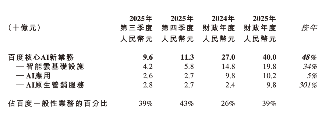 2025年第四季度,百度核心AI新业务收入超过110亿元,同比增长48%,在“一般性业务”中的占比达到了43%,这是今年的新高。