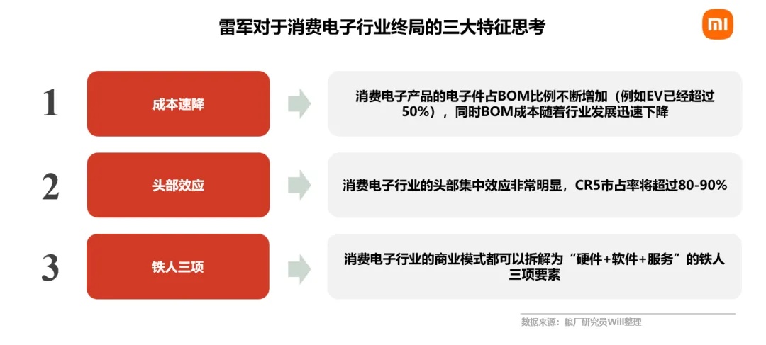 雷军在不同场合分享过他对消费电子行业特征的思考,核心三点: