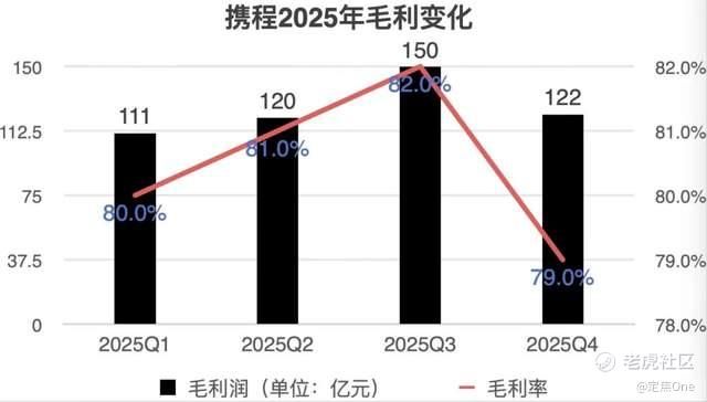 毛利率也相当惊人。按2025年各季度来看,携程毛利率分别为80%、81%、82%、79%。从全年来看,2023年-2025年,其毛利率分别为82%、82%、81%。