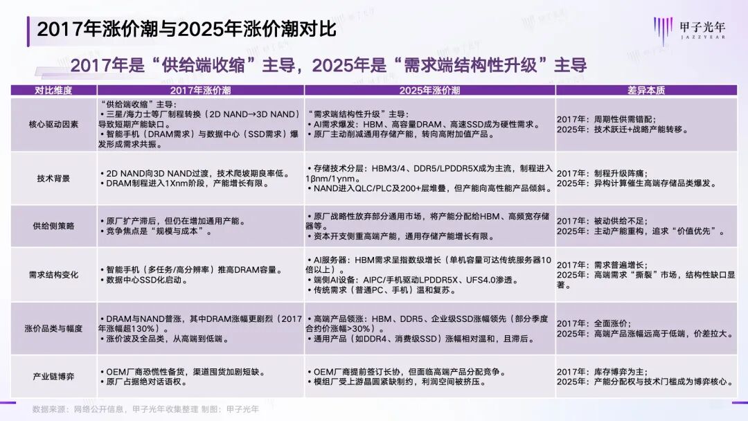 2017年与2025年存储涨价潮核心差异对比,“甲子光年”制图