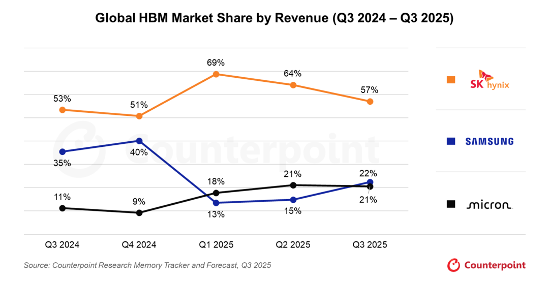 2024 Q3-2025 Q3三大原厂HBM营收市场占比,图片来源:Counterpoint