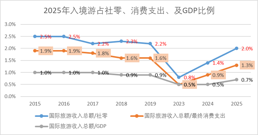 2025年入境游已经成为中国社会经济的重要向上驱动力之一,根据华泰证券测算,2024 年中国国际旅游收入约 942.4 亿美元,占社零 /GDP 最终消费支出的比例分别为 1.4%,0.9%;考虑到社零统计口径中对旅游服务涵盖较少,华泰证券估算入境游对2025年最终消费支出/GDP的拉动或为0.4/0.3个百分点。