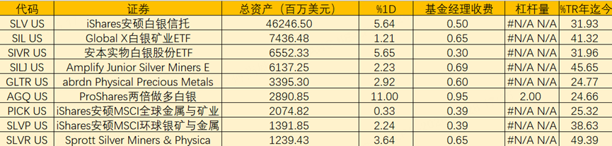 白银ETF方面, $白银ETF-iShares(SLV)$ 年内涨幅31.93%,是规模最大的实物白银ETF之一; $Silver Miners Etf(SIL)$ 年内涨幅41.32%,为白银矿业主题ETF; $Amplify Junior Silver Miners ETF(SILJ)$ 年内涨幅45.65%,聚焦小型银矿企业; $2倍做多白银ETF-ProShares(AGQ)$ 作为两倍杠杆白银产品,今年涨幅24.66%。