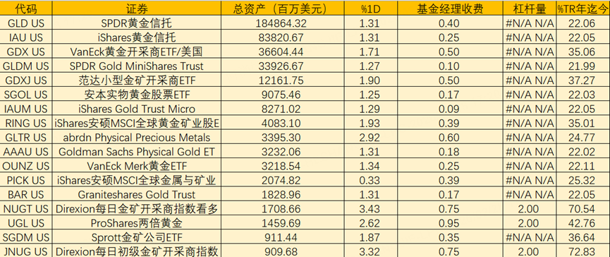 黄金ETF方面:规模最大的实物黄金ETF $黄金ETF-SPDR(GLD)$ 年内涨幅 22.06%; $黄金信托ETF-iShares(IAU)$ 年内上涨 22.05%。黄金矿业ETF中,GDX 年内涨幅 35.06%; $小型黄金矿业ETF(Market Vectors)(GDXJ)$ 年内上涨 37.27%。杠杆类产品中, $金矿指数二倍做多ETF(JNUG)$ 年内涨幅 72.83%; $二倍做多黄金矿业指数ETF-Direxion(NUGT)$ 年内上涨 70.54%。此外,多贵金属综合配置ETF $abrdn Physical Precious Metals Basket Shares ETF(GLTR)$ 年内上涨 24.77%。