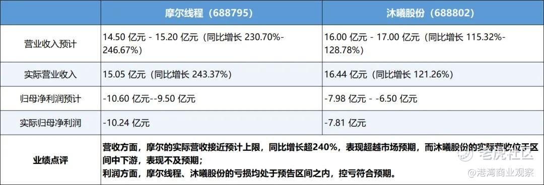 营收方面,摩尔的实际营收接近预计上限,同比增长超240%,表现超越市场预期,而沐曦股份的实际营收位于区间中下游,表现不及预期;利润方面,摩尔线程、沐曦股份的亏损均处于预告区间之内,控亏符合预期。