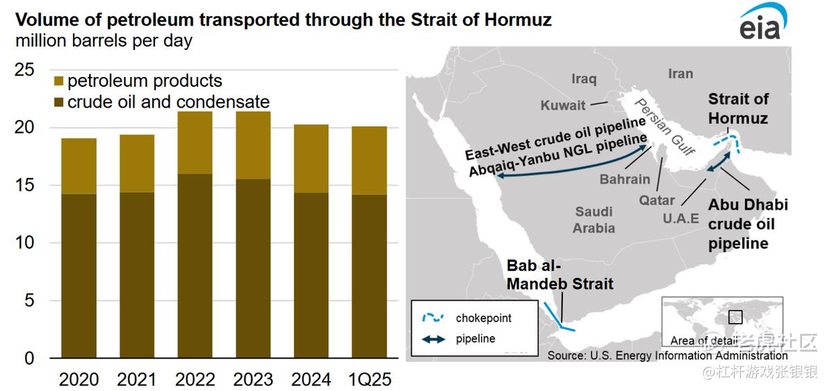 数据显示,霍尔木兹海峡每天运出去2000万桶原油,占全球海运石油约25%左右。沙特、伊拉克、阿联酋、科威特的大部分原油出口依赖这条水道,卡塔尔几乎全部液化天然气出口亦经此运输。