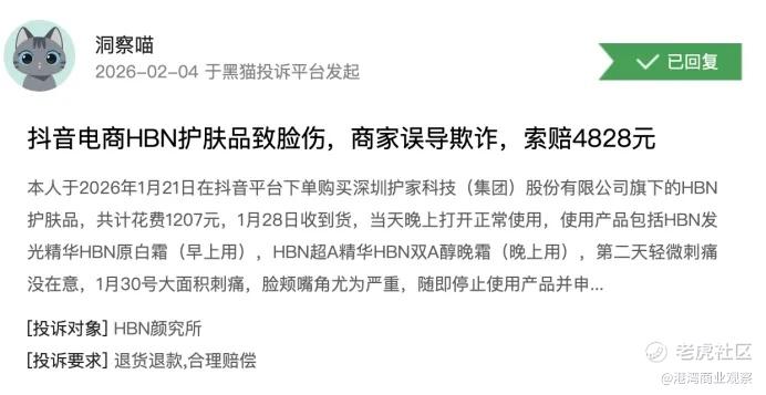 2026年2月4日,用户“洞察喵”发起投诉称,其于1月21日在抖音平台购买护家科技旗下HBN护肤品,共计花费1207元,产品包括HBN发光精华HBN原白霜、HBN超A精华HBN双A醇晚霜。该用户表示,1月28日收到货后当晚正常使用,次日出现轻微刺痛未予在意,1月30日出现大面积刺痛,脸颊嘴角尤为严重,随即停止使用产品并申请维权,诉求为退货退款及合理赔偿,索赔金额4828元。