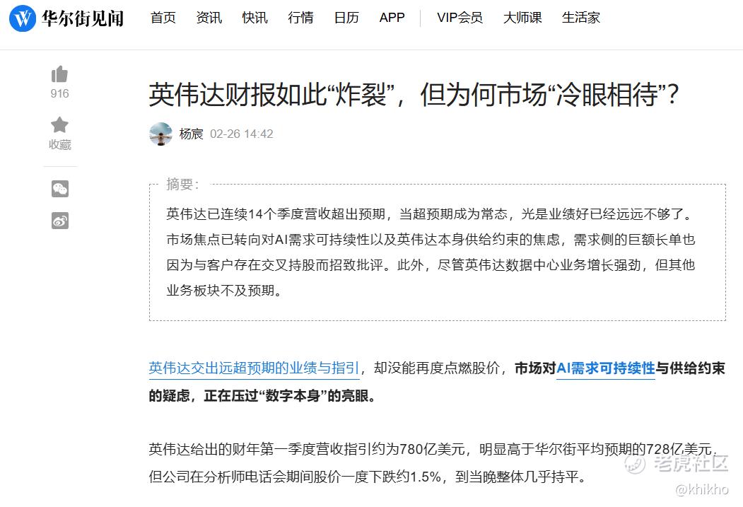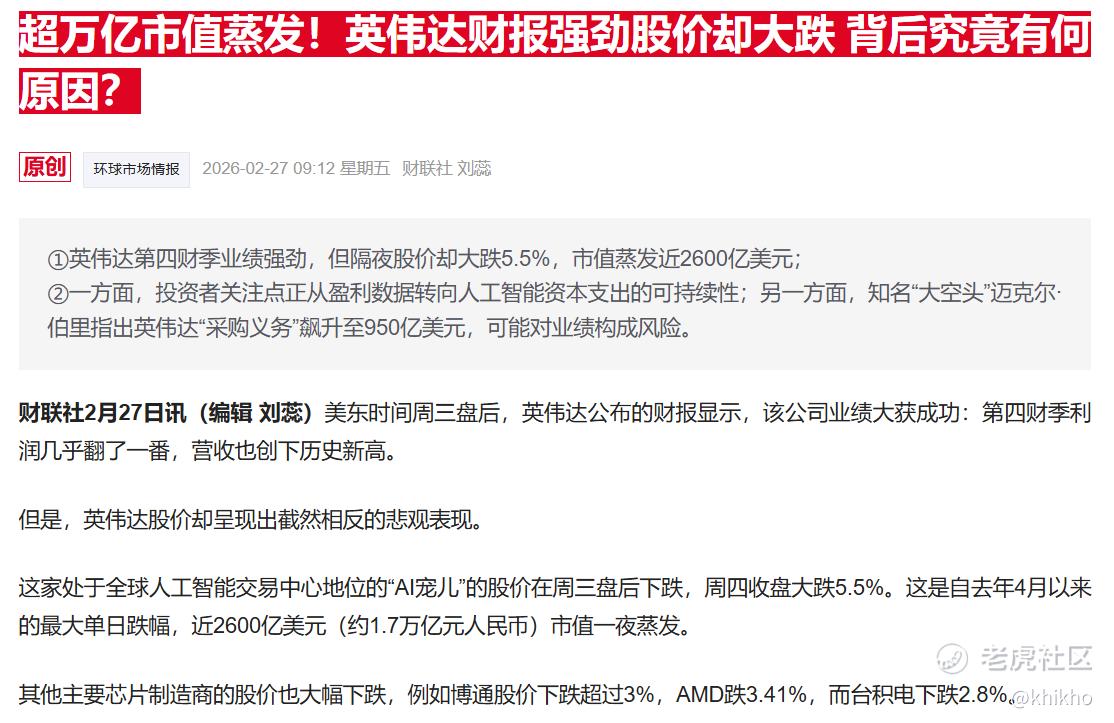 2026年2月25日美股盘后,全球市值最高的芯片公司 $英伟达(NVDA)$ 公布了他们2026财年的第四季度财报。作为AI工业革命的最强引擎,大家对他的期望,是越来越高,总感觉他们的财报就应该优秀,当超预期成为新常态,如果没有额外的惊喜,那就不算是一份好成绩。