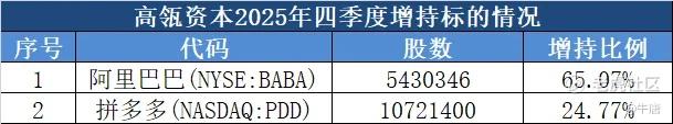 连续四个季度增持拼多多。2025年的每个季度,高瓴资本都在增持拼多多,全年合计增持幅度达292.69%。