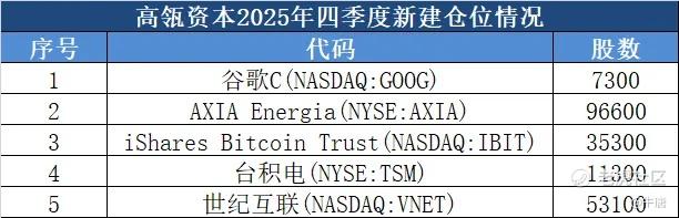 2025年三季度建仓的百度,因旗下AI芯片昆仑芯业绩看好,与招商银行等达成AI场景应用等利好的出现,公司股价上涨了53.65%。而此前,高瓴资本在2025年一季度建仓,并于二季度清仓了百度。