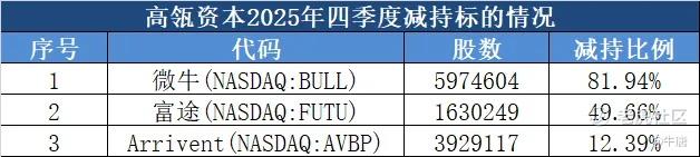 2025年三季度,富途控股上涨了40.72%,股价在四季度仍在高位,高瓴资本在三季度减持24.91%的基础上,再次减持49.66%,但富途仍位列第四大仓位。而上季度的第四大仓位微牛证券,也被减持81.94%,高瓴似乎不看好中资券商的前景。